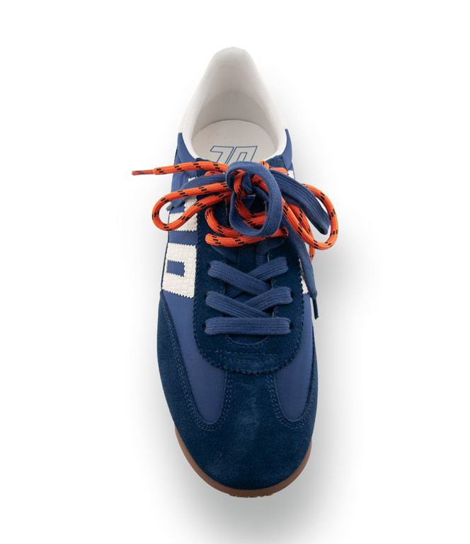 Der Back70 Jogger kombiniert den authentischen Charme der 70er-Jahre mit einer modernen, cleanen Optik. Das Obermaterial aus kräftigem blauem Textil und Veloursleder wird durch ein helles Weiß ergänzt, was dem Sneaker eine frische Leichtigkeit verleiht. Die Besonderheit liegt im Detail: Ein leuchtend orangefarbener Streifen im hellen Keil der Sohle und das passende orangefarbene Schuhband setzen gezielte Farbakzente, ohne aufdringlich zu wirken.