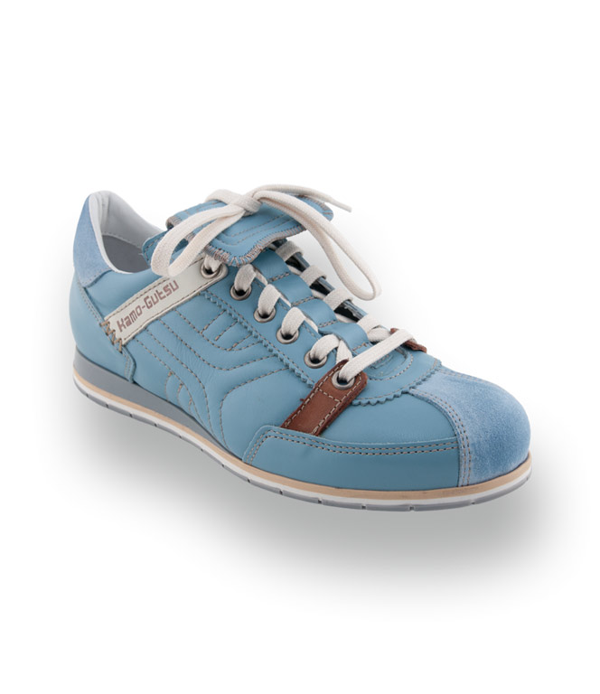 Der Kamo Gutsu Tifo 015 für Damen interpretiert den klassischen Look alter Sportschuhe völlig neu. Das Obermaterial aus superweichem, abgestepptem Glattleder in einem frischen Hellblau sorgt für eine besonders edle Optik. Das modische Highlight dieses Modells ist die umgeklappte Lederlasche am Schaftabschluss oberhalb der Schnürung, die dem Sneaker eine feminine und zugleich avantgardistische Note verleiht.