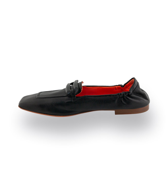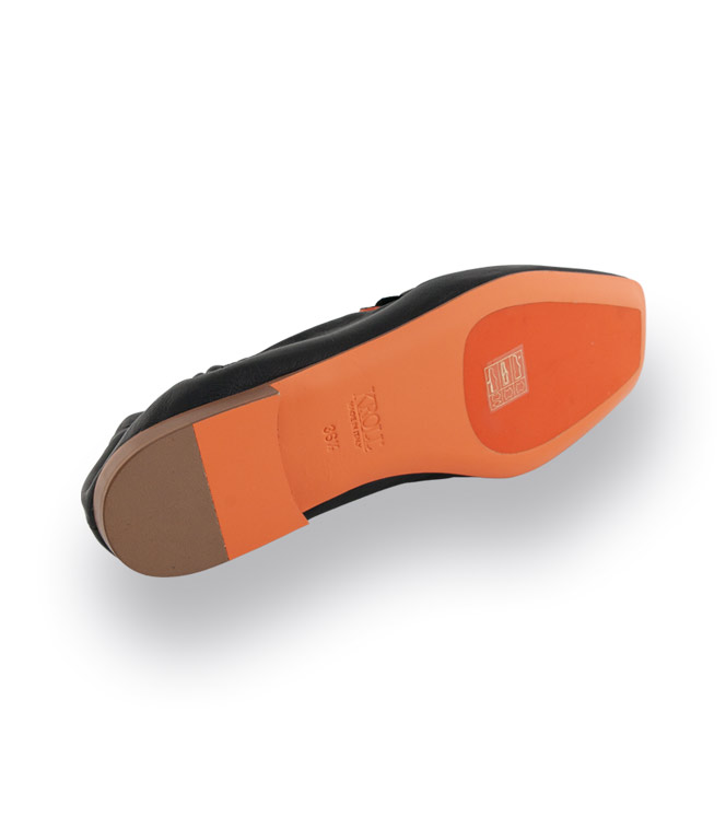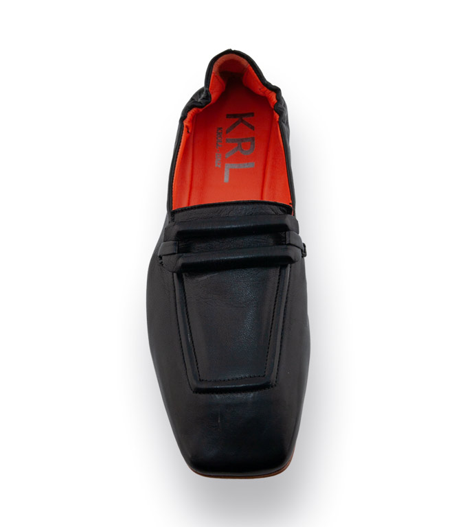 Dieser schwarze Loafer von Kroll in modischer Karreeform vereint zeitlose Eleganz mit höchstem Tragekomfort. Das weiche Nappaleder schmiegt sich angenehm an den Fuß, während die lederüberzogene Spange und die markante Naht klassische, feminine Akzente setzen. Durch die aufwendige Sacchetto-Machart ist der Schuh besonders flexibel und traumhaft weich, der Gummizug an der Ferse unterstützt die ausgezeichnete Passform. Innen sorgt das charakteristische orangefarbene Lederfutter für ein angenehmes Fußklima. Die orangefarbene Ledersohle mit rutschsicherem Gummieinsatz bietet stabilen Halt. Mit einer Absatzhöhe von ca. 1,5 cm ist dieser Loafer ideal für stilvolle Alltags- und Büro-Looks.