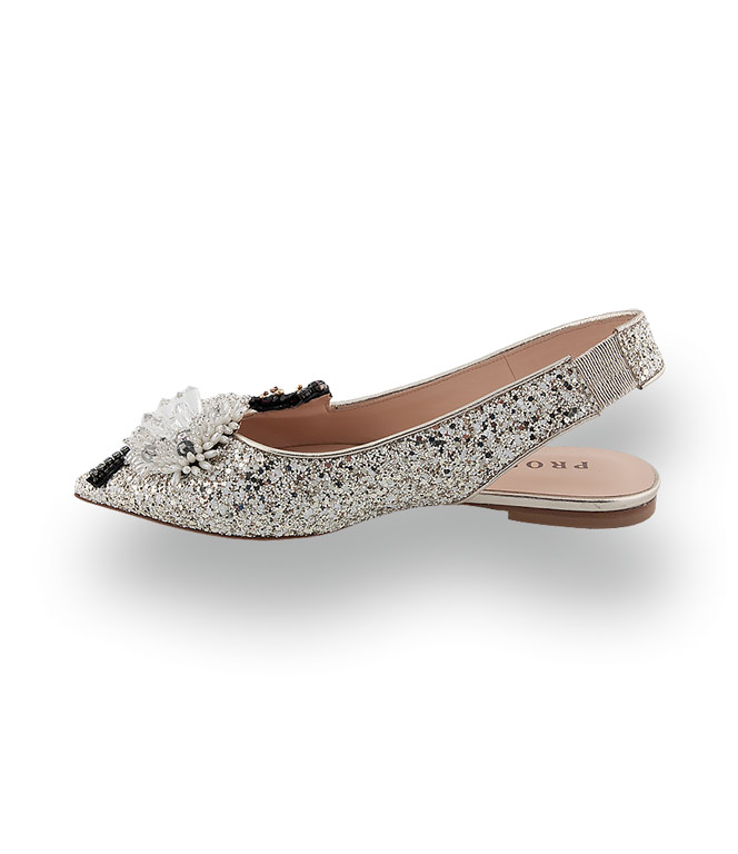 Traumhafter Slingback für Romantikerinnen. Goldfarbener Glitter wird mit weiß und Silber in Szene gesetzt. Verspielte Blüten aus Perlen, goldfarbenen Kügelchen und funkelndem Strass in elegantem schwarz/weiß schmücken den spitzen Sling. Weiches Lederfutter, goldfarbenes Paspol und ein Gummieinsatz im Riemen sorgen für eine optimale Passform. Prosperine aus Italien sorgt für einen bühnenreifen Auftritt.