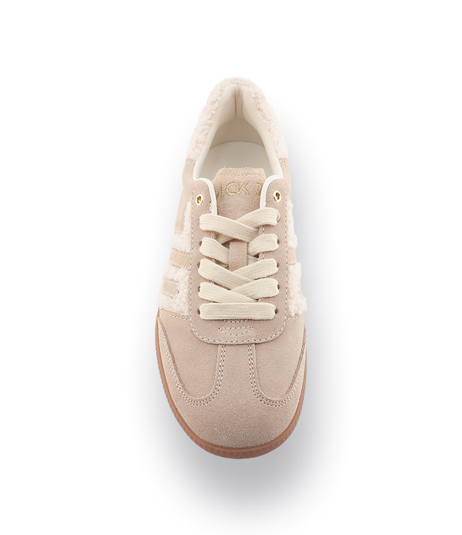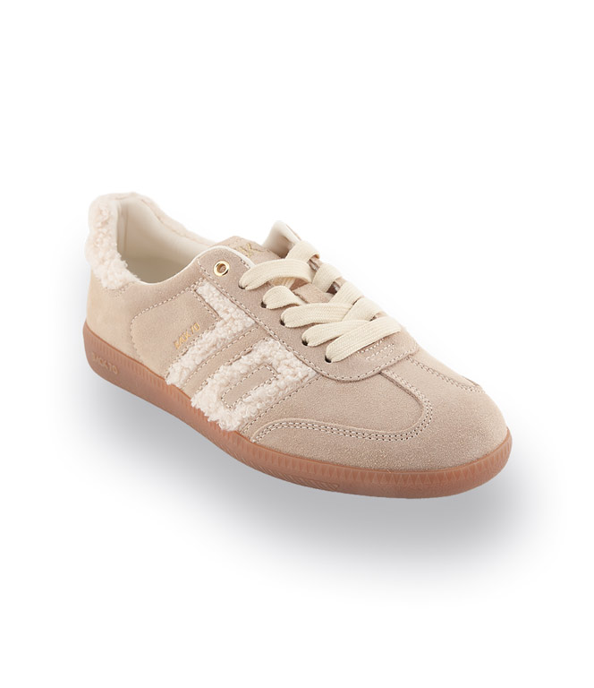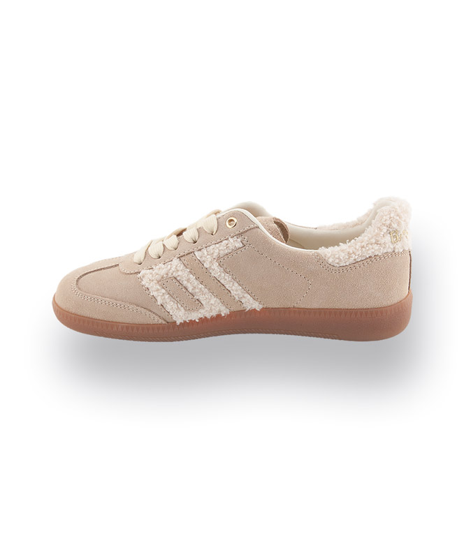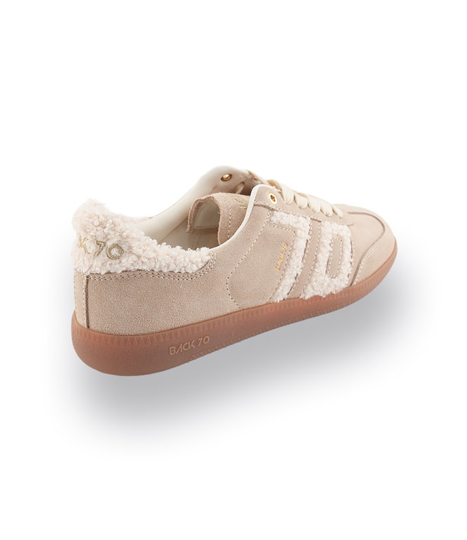 Der Back70 Cloud 605 Fur in Beige mit wollweißen Akzenten vereint modernen Retro-Style mit maximalem Komfort. Die Kombination aus samtigem Velours und kuscheligem Teddy-Material sorgt für einen außergewöhnlichen Look und macht den Sneaker zum modischen Highlight. Die flexible, leichte Gummisohle garantiert ein angenehmes, federndes Laufgefühl, während das atmungsaktive Textilfutter und die herausnehmbare Innensohle für optimalen Komfort sorgen. Der markante 70er-Jahre-Schriftzug unterstreicht den Vintage-Charme. Dank der harmonischen Farbkombination lässt sich der Schuh vielseitig kombinieren – ideal für Frauen, die Wert auf stilvolle Details und Bequemlichkeit legen.