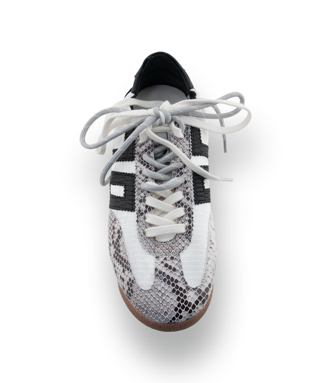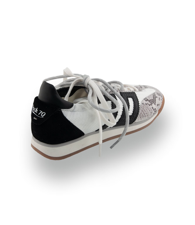 Der Back70 Rocket kombiniert sportliche Dynamik mit exklusiven Details. Das Design besticht durch einen hochwertigen Mix aus Glattleder, Velours und Textil, der durch Einsätze in grau-schwarzer Schlangenprägung perfekt ergänzt wird. Ein besonderes modisches Highlight ist die Fersenpartie mit elastischem Gummi, die nicht nur modern aussieht, sondern auch für eine optimale Anpassung sorgt. Geliefert wird das Modell mit zweierlei Schuhbändern, sodass Sie den Look Ihres Sneakers ganz individuell variieren können.