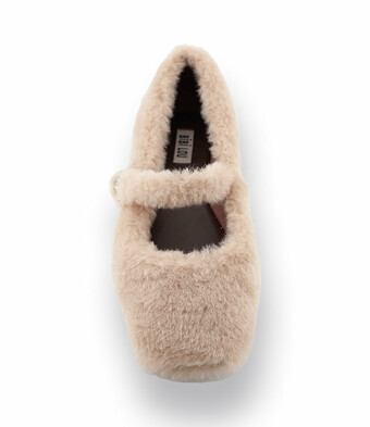 Plüsch ist angesagt und Ballerinas sind in dieser Saison ein starkes Thema. Eine Vielfalt an Materialien ist geboten. Bibi Lou zeigt den Mary Jane im beigen Plüsch in Karreeform und ein Strassblümchen ziert den Flats.