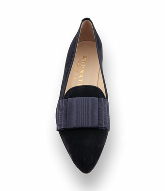 Dunkelblaues Veloursleder eine effektvolle Moiréschleife und die elegante spitze Kappe veredelt ihr Outfit auf stilvolle Weise. Feinstes Futterleder und eine Gummisohle begünstigen den Tragekomfort. Modischer Chic aus Italien.