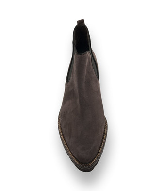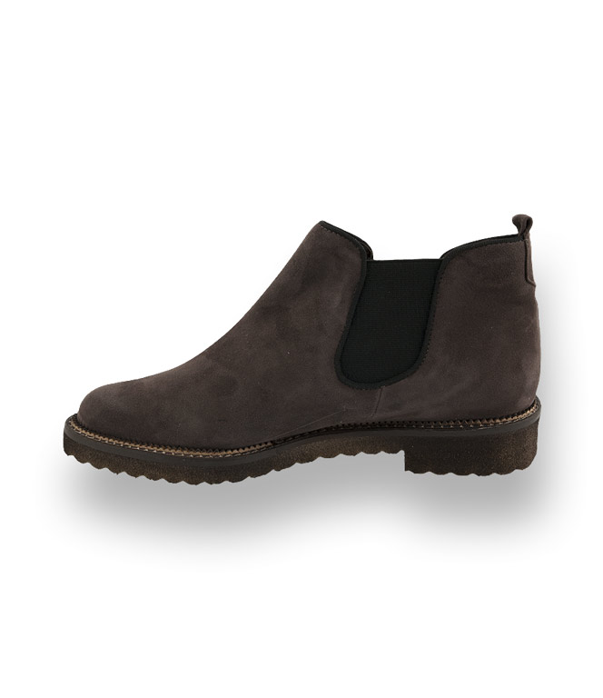 Weiches Velour und Kalbslederfutter verwöhnt ihre Füße. Der taupefarbene spitze Boot ist mit einem sichtbaren braunen Rahmen ausgestattet. Schwarze Gummieinsätze mit Ripspaspellierung sorgen für einen leichten Schlupf. Der federleichte geschäumte Boden in Kreppoptik misst im Absatzbereich 3 cm.