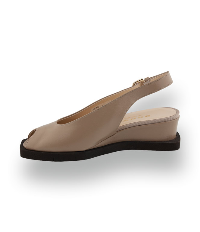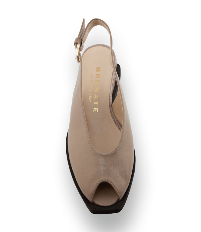Sommerliche Leichtigkeit in architektonischem Design. Dieser zehenfreie Slingpumps von Brunate in edlem Beige ist die perfekte Symbiose aus modischem Wagemut und klassischer italienischer Eleganz. Das absolute Highlight ist die innovative, ultraleichte Gummisohle, die rundherum markant über das Oberleder hinausragt.