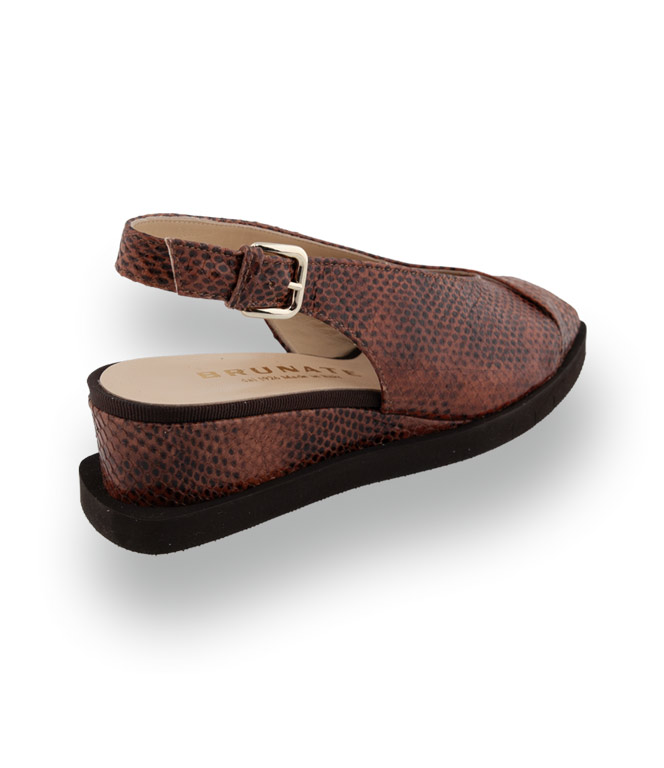 Dieser zehenfreie Slingpumps von Brunate ist ein absolutes Highlight für Liebhaberinnen besonderer Strukturen. Das hochwertige Glattleder besticht durch eine edle Schlangenprägung in warmen Brauntönen, die dem Schuh eine luxuriöse Tiefe verleiht. Ein funktionales und zugleich modisches Detail ist die raffinierte Kreuzbandage über dem Spann, die nicht nur optisch überzeugt, sondern auch für eine außergewöhnlich gute Passform und festen Halt sorgt.