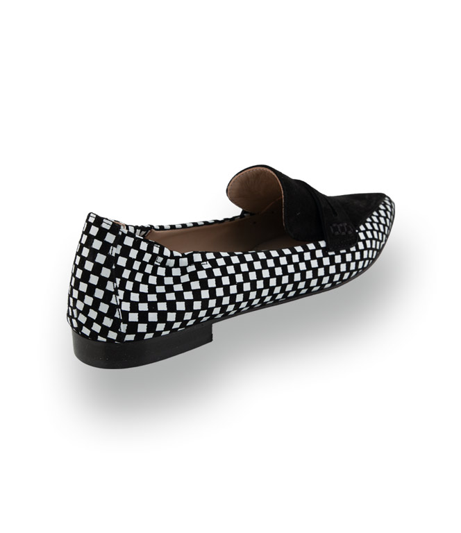 Dieser Loafer von Carraro ist ein echtes Statement für Liebhaberinnen des schwarz-weißen Looks. Das Design spielt gekonnt mit Texturen: Das Vorderblatt besteht aus schwarzem, samtigem Veloursleder, während der restliche Schuh durch ein glanzvolles Karo-Muster aus Velours und Lack besticht.