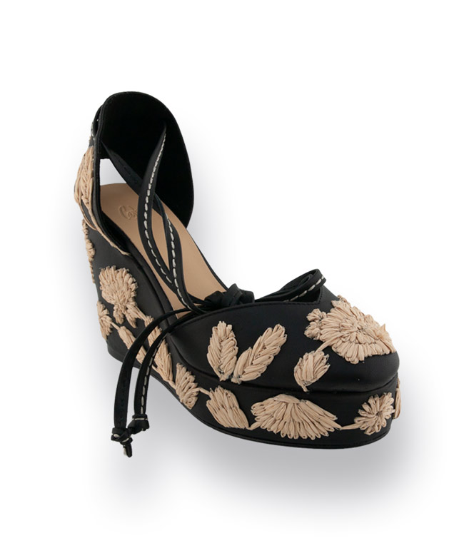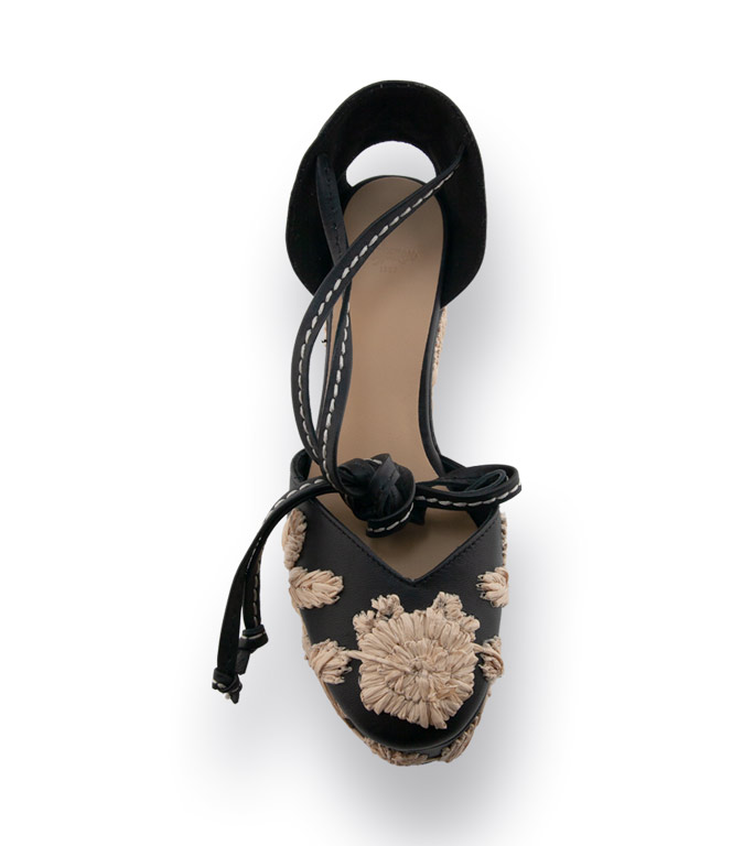 Castaner, der spanische Spezialist für Espadrilles und außergewöhnliche Schuhe, präsentiert diesen eleganten Wedge in Schwarz mit markantem Plateau und Keilabsatz. Feines Glattleder trifft auf hellbeige Baststickerei in liebevoller Handarbeit – ein edler Kontrast, der den Schuh sofort ins Auge fallen lässt. Das lange Lederband, das um Fessel und Wade gebunden wird, sorgt nicht nur für sicheren Halt, sondern setzt das Bein besonders schön in Szene. Innen ist der Wedges komplett mit Leder gefüttert und bietet in Kombination mit dem Plateau einen angenehm bequemen Tragekomfort bei etwa 9 cm Absatzhöhe.