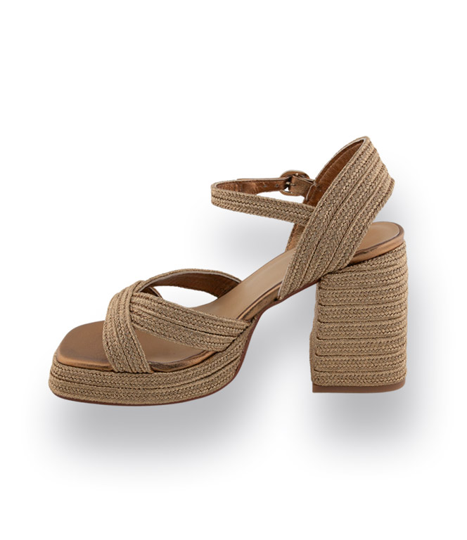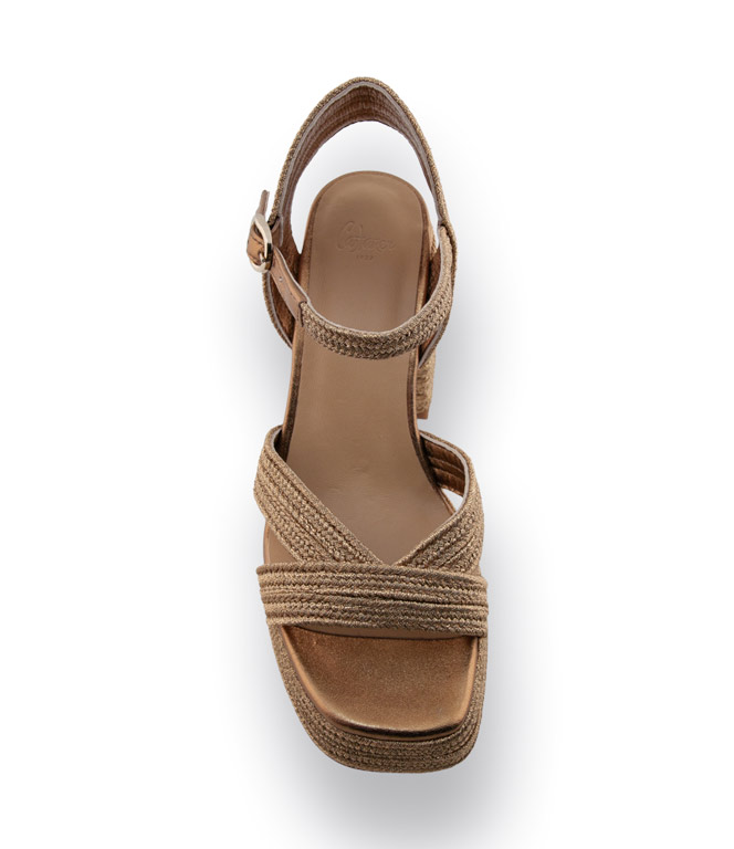 Castaner, der spanische Spezialist für Espadrilles und außergewöhnliche Schuhe, präsentiert diese edle Sandale in funkelndem Goldton mit markantem Plateau und ca. 9 cm hohem Absatz. Das hochwertige Textilmaterial mit feinem Lurexglanz sorgt für eine glamouröse Ausstrahlung und macht den Schuh zum eleganten Eyecatcher. Kreuzbandage und Riemchen geben sicheren Halt und betonen Knöchel und Fuß auf besonders feminine Weise. Innen ist die Sandale komplett mit weichem Leder gefüttert und bietet in Kombination mit dem Plateau einen überraschend bequemen Tragekomfort. Ideal für besondere Anlässe und alle, die schimmernde Akzente und mediterranen Chic lieben.