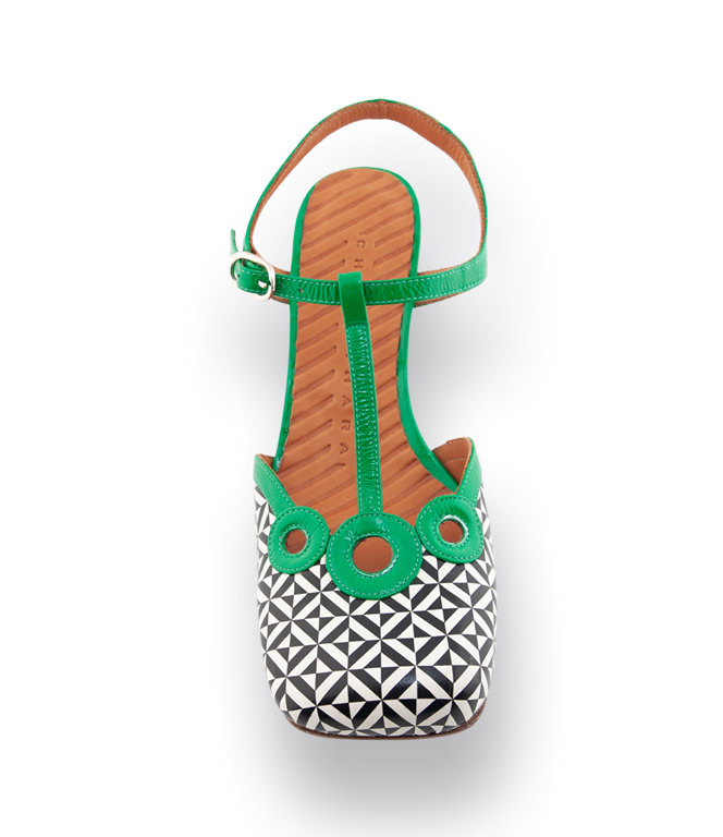 Die dekorative Stegspange aus Lackleder sorgt nicht nur für einen besonderen Look, sondern bietet zugleich perfekten Halt. Bedrucktes Glattleder und grünes Lackleder unterstreichen die detailverliebte Handschrift des spanischen Kultlabels Chie Mihara.