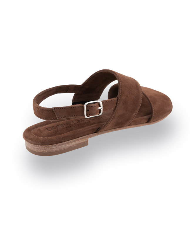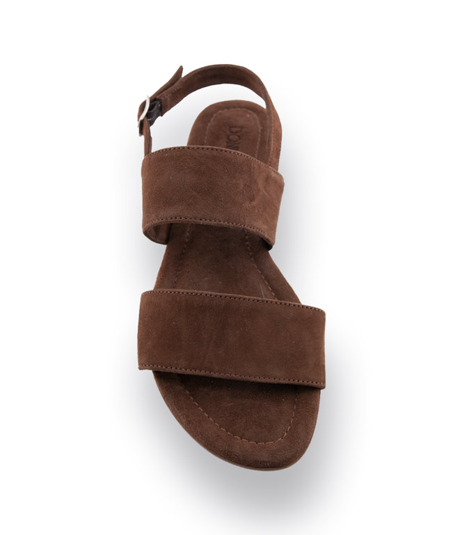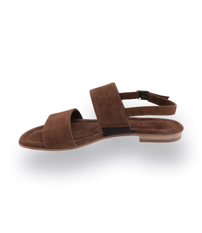 Diese braune Donna Carolina Sandale aus softem Veloursleder ist die Sandale schlechthin für alle, die perfekte Passform und Komfort schätzen. Wie von Donna Carolina gewohnt, überzeugt das Modell mit hochwertiger Verarbeitung und einem besonders angenehmen Tragegefühl. Zwei perfekt angeordnete Riemen sorgen für sicheren Halt, ohne einzuschneiden. Der obere Riemen ist seitlich mit einem elastischen Einsatz gearbeitet, sodass der Fuß beim Gehen und Abrollen bequem geführt wird. Ledergefüttertes Innenleben, gepolsterte Lederdecksohle und eine Ledersohle machen diese flache Sandale mit ca. 2 cm Absatz zu einem vielseitigen Lieblingsschuh für jeden Tag und viele Outfits.
