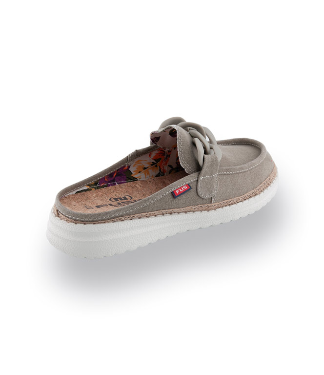 Der Fusion Sabbot Ella präsentiert sich in einem eleganten hellbeigen Canvas-Design, das ideal für den Sommer ist. Die ultraleichte Sohle sorgt für ein unbeschwertes Tragegefühl, während das bunte Textilfutter im Blumenmuster Urlaubsstimmung aufkommen lässt. Eine abnehmbare Einlegesohle aus natürlichem Kork, kombiniert mit Aktivkohle-Granulat, bietet optimalen Komfort und schützt vor Fußgeruch.