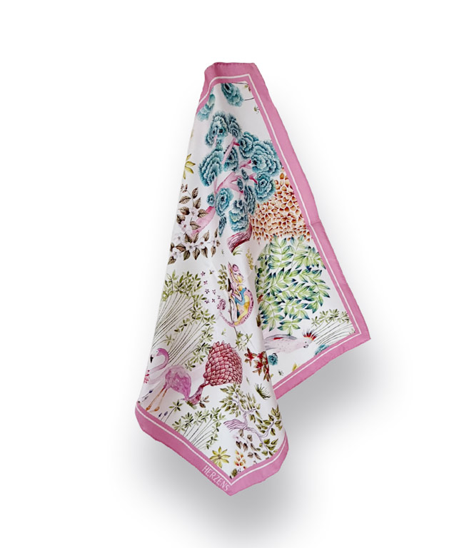 Dieses Seidentuch von Herzens ist ein farbenfroher Hingucker und verleiht jedem Outfit eine feminine Note. Der bunte Print mit Blumen und Flamingos auf weißem Grund wird von einem frischen, pinkfarbenen Rand eingerahmt – ideal für Frühlings- und Sommer-Looks. Das Tuch besteht aus 100 % hochwertiger Seide und fühlt sich besonders weich und luxuriös auf der Haut an.