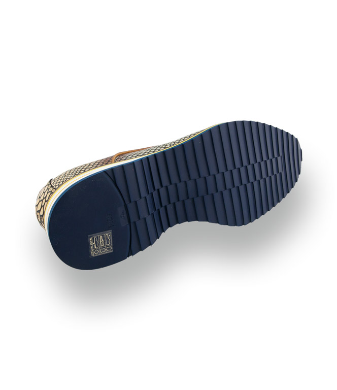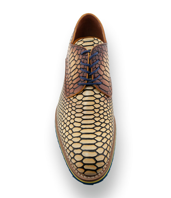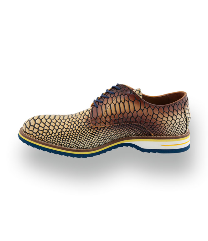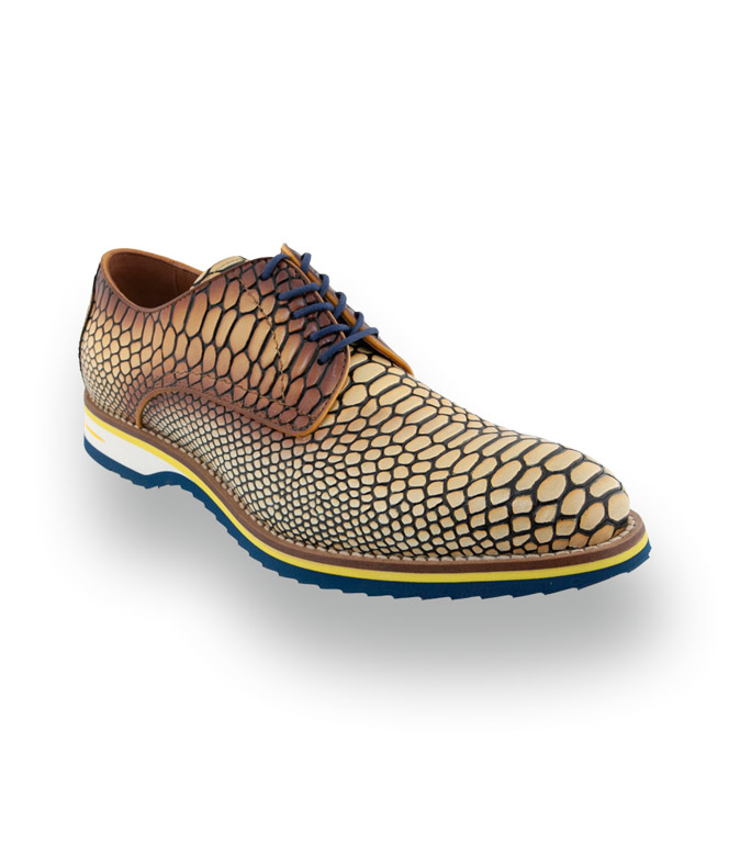 Der italienische Edel-Hersteller Lorenzi präsentiert mit diesem Modell ein echtes Statement für Männer mit Stilbewusstsein und Mut zur Farbe. Das hochwertige Glattleder besticht durch eine markante Krokoprägung, deren Farbverlauf in warmem Gelb und Braun alle Blicke auf sich zieht. Für den modernen Twist sorgen die blauen Schuhbänder, die perfekt auf die blaue Gummisohle mit Profil abgestimmt sind.