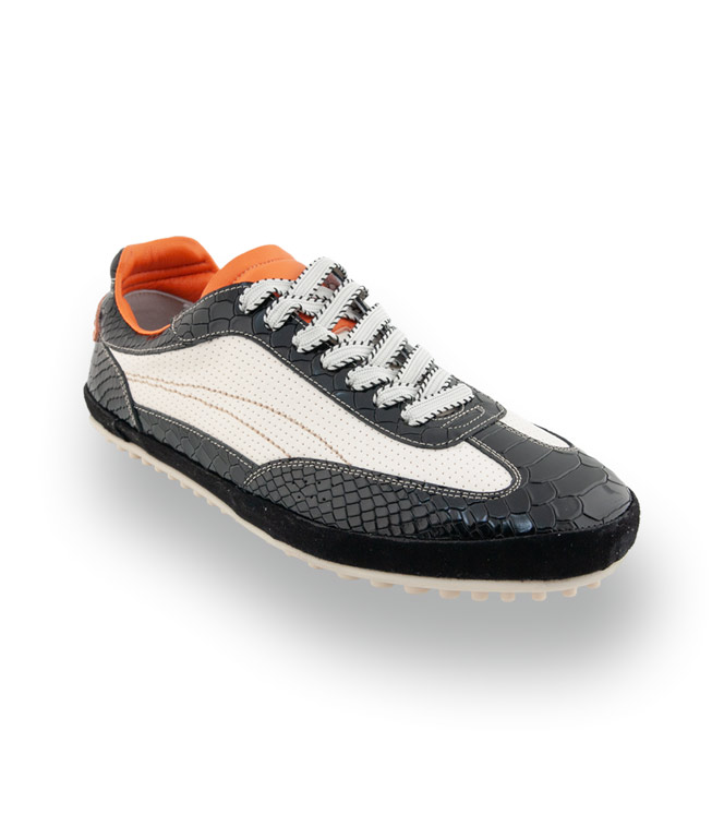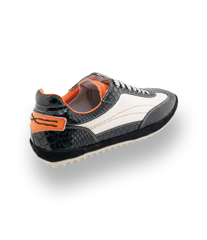 Dieser Lorenzi Edelsneaker spielt virtuos mit Kontrasten und Texturen. Die Basis aus edlem schwarzem Leder in Krokoprägung und weißem, gestanztem Leder wird durch leuchtende Akzente in Orange perfekt in Szene gesetzt. Besonders die orangefarbene Zunge und der markante Fersenabschluss sind optische Highlights, die dem Schuh seinen unverwechselbaren, progressiven Charakter verleihen.