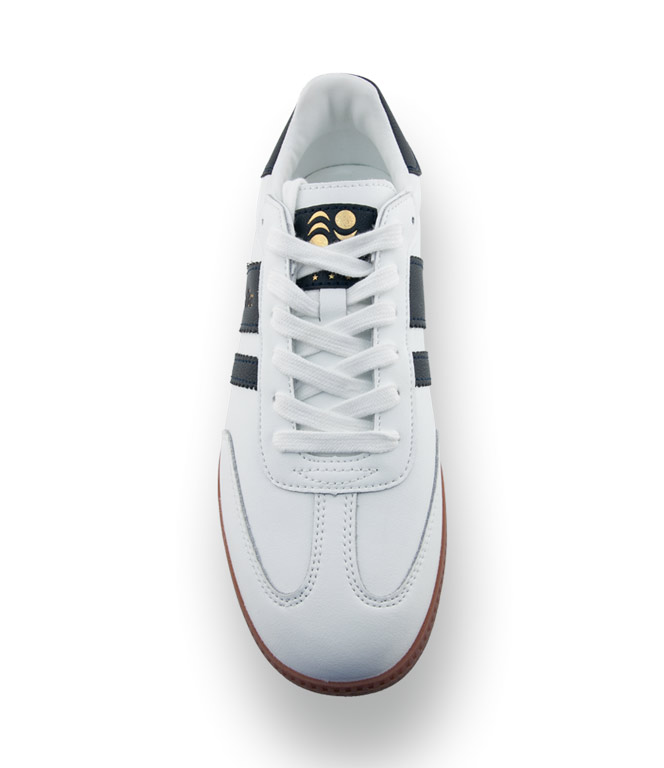 Der Pantofola d'Oro Bomber ist die perfekte Wahl für Männer, die sportliche Lässigkeit mit einem Hauch von Luxus verbinden möchten. Das hochwertige weiße Glattleder bildet die Basis für die ikonischen zwei blauen Seitenstreifen. Besonders edel wirkt der goldfarbene Markenaufdruck, der diesem Sneaker seine exklusive Note verleiht.