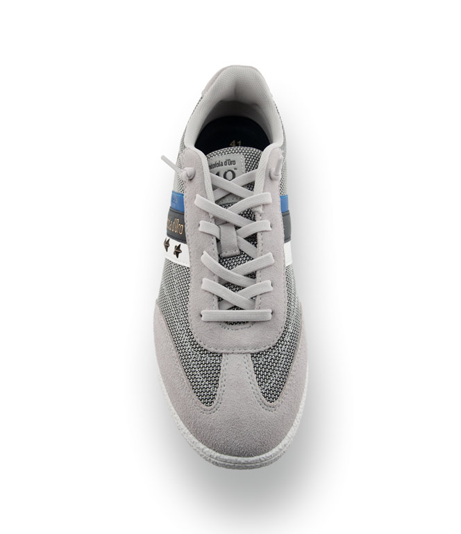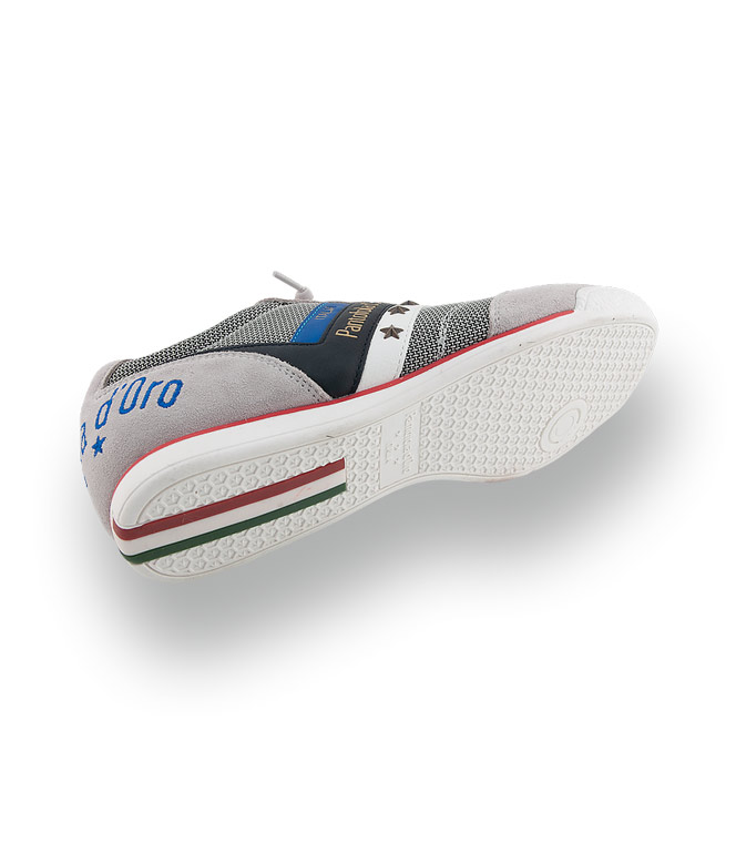 Dieser exquisite Sneaker von Pantofola d'Oro besticht durch sein hochwertiges Veloursleder in sanftem Hellgrau, das durch blaue Einsätze sportiv belebt wird. Der leuchtend rote Streifen im Sohlenkeil setzt einen dynamischen Akzent und verleiht dem Schuh eine sommerliche Frische. Dank der flexiblen Gummisohle und der herausnehmbaren Innensohle genießen Sie maximalen Komfort und eine individuelle Passform. Die leichte Kombination aus Leder und Textil macht diesen Sneaker zum idealen Allrounder für stilsichere Herren.