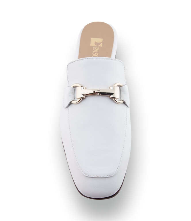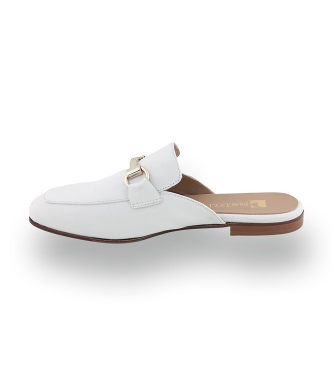 Dieser edle Pascucci Mule aus hochwertigem weißem Glattleder bringt Frische in Ihre Garderobe. Das lange Blatt umschließt den Fuß sanft und garantiert einen sehr guten Halt, während die glänzende Metallspange für ein luxuriöses Finish sorgt. Dank der kompletten Lederfütterung und der durchdachten Ledersohle mit Gummieinsatz vereint dieser Schuh italienisches Design mit höchster Alltagstauglichkeit.