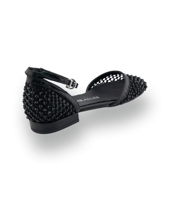 Diese exklusive Ballerina von Pedro Miralles besticht durch ihren luxuriösen Materialmix aus transparentem Netzstoff (Mesh) und filigranem Geflecht. Besetzt mit zahlreichen schwarzen Strasssteinchen, sorgt dieses Modell für einen glanzvollen Auftritt. Die modische Karree-Form und die seitlich offene Fenster-Optik verleihen dem Schuh eine feminine Leichtigkeit. Dank des zarten Fesselriemens genießen Sie einen hervorragenden Halt, während die flache Bauweise maximalen Tragekomfort garantiert. Ein modisches Highlight, das perfekt zu festlichen Kleidern oder eleganten Hosenkombinationen passt.