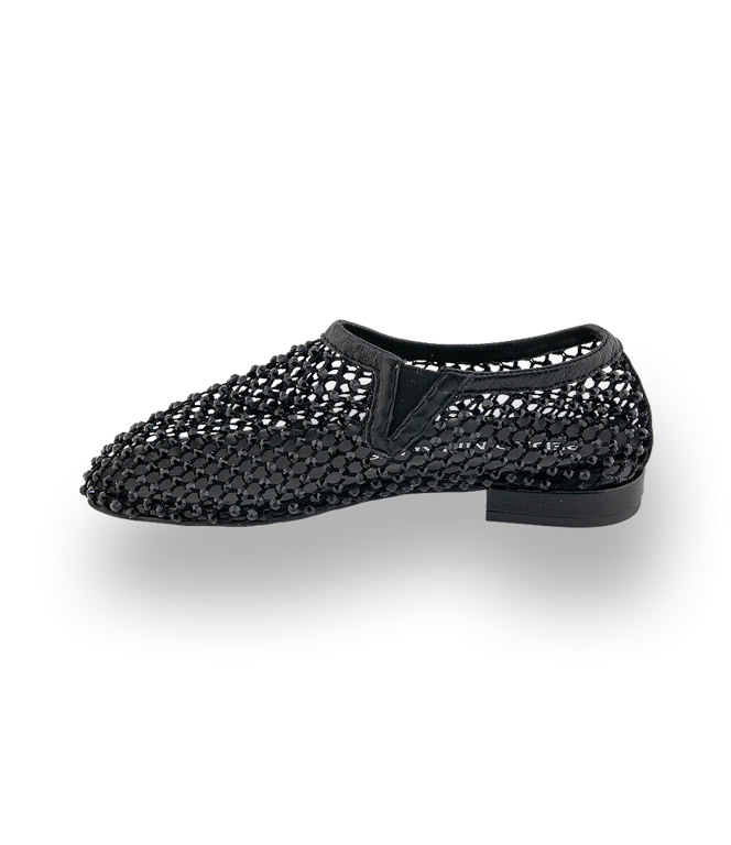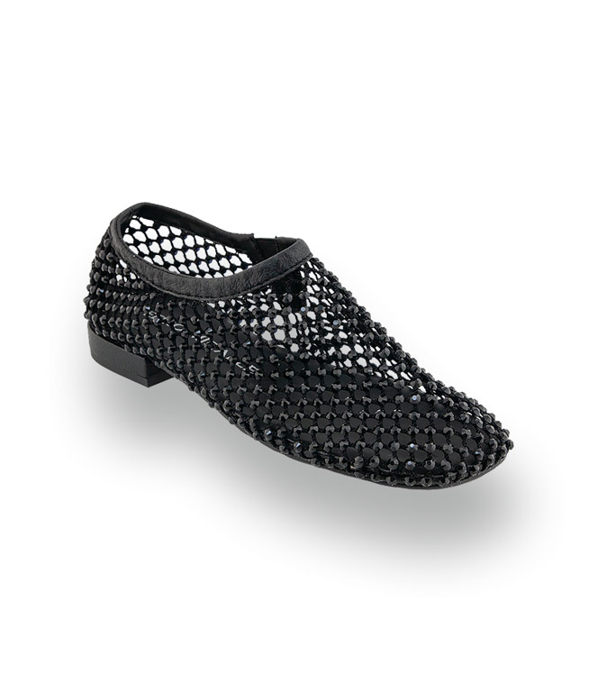 Dieser exquisite Slipper verzaubert durch sein filigranes Netz-Design, das sanft mit der Haut spielt und sommerliche Frische garantiert. Die Strass-Steinchen fangen jedes Lichtspiel ein und verleihen Ihrem Look einen magischen Glanz. Dank der modernen Karree-Form genießen Sie modische Finesse, während der flache Absatz Sie federleicht durch den Tag trägt.