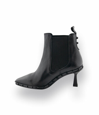 Chelseaboot vom Feinsten. Kegelnieten gekonnt auf Rahmen appliziert. Pedro Miralles verpasst dem herkömmlichen Schuhtyp einen neuen Anstrich. Weiches schwarzes Leder, Gummieinsätze für den raschen Einstieg und einen taillierten Absatz der die Weiblichkeit unterstreicht. Lederfutter und eine angenehm weiche Gummisohle unterstützen den Tragekomfort.
