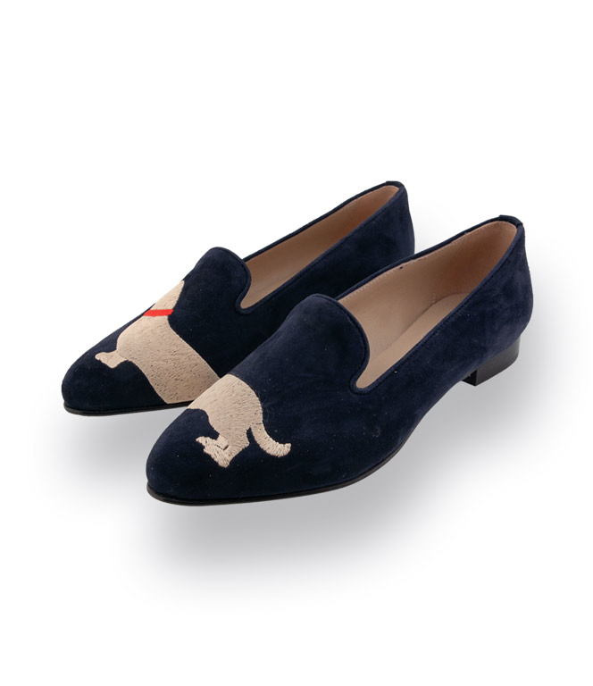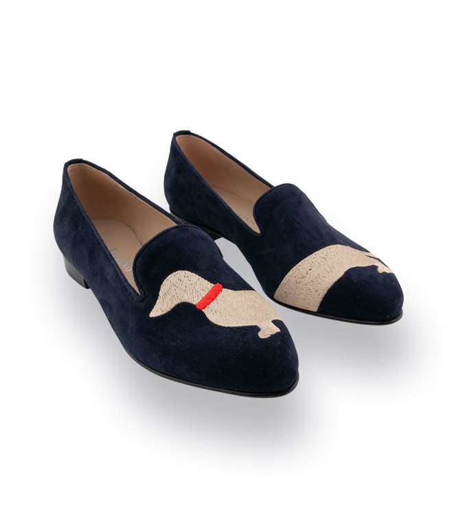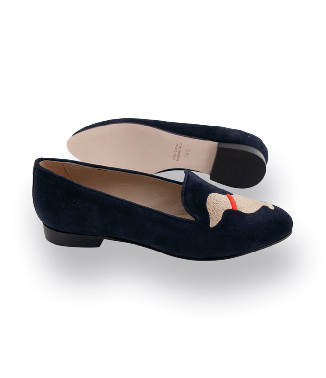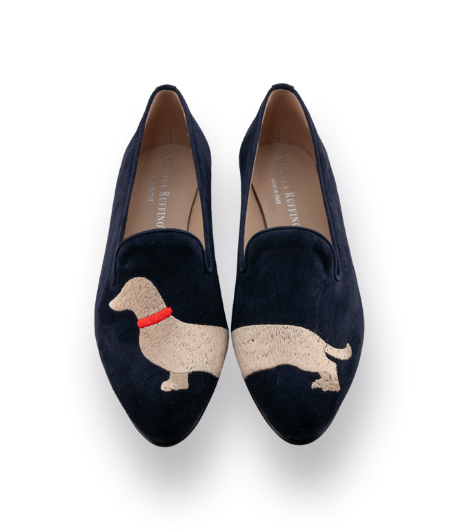 Michela Ruffino blauer Loafer mit Dackel bestickt