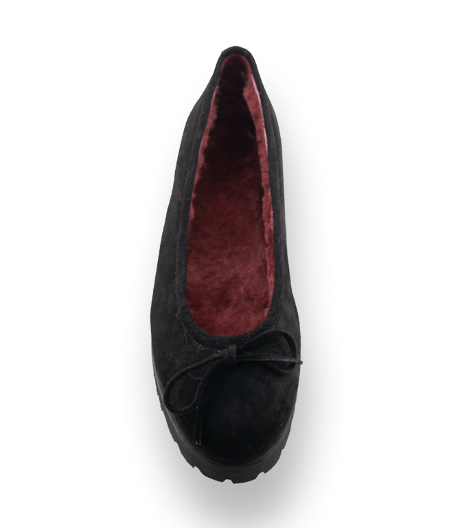 Der klassische Ballerina in schwarz Velours mit kleiner Schleife und rotem Lammfellfutter von Michela Ruffino, sorgt für wohlig warme Füße an kalten Tagen. Veloursleder und kuscheliges Lammfellfutter garantieren ein Wohlfühlerlebnis. Die geschäumte, leicht profilierte Sohle, ist federleicht und sorgt für Trittsicherheit. Zu blickdichten Strümpfen eine echte Alternative zum Stiefel.