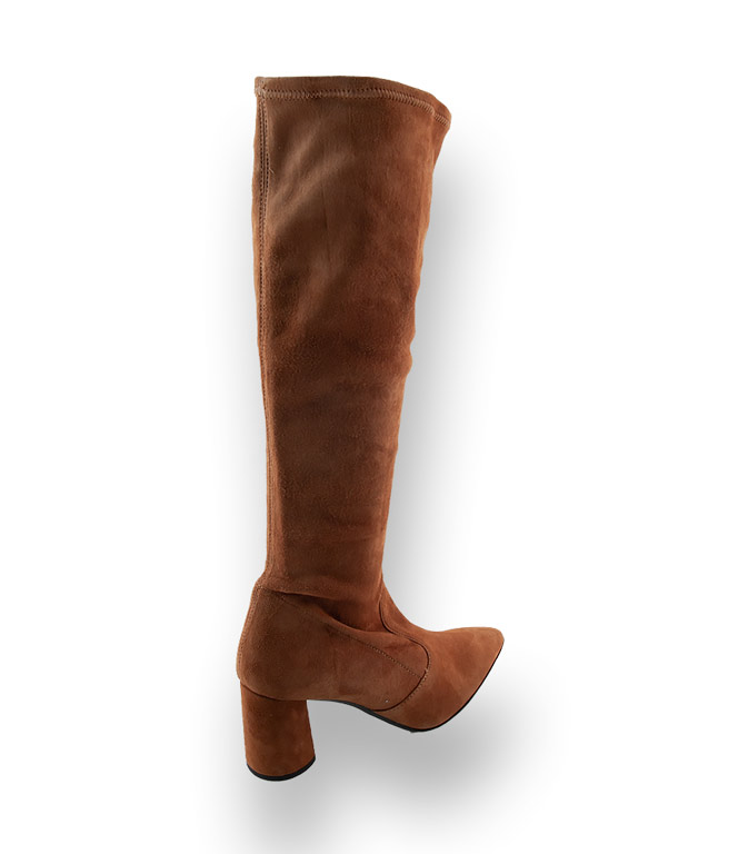 Weiches Stretchvelours umschmeichelt die Wade und sitzt wie angegossen. Der Fußbereich ist Ledergefüttert. Die spitze Form harmoniert mit dem trendigen, Lederbezogenen Säulenabsatz. Die Gummilaufsohle bietet Schutz vor Nässe. Der feminine Stiefel passt pefekt zu den neuen überschnittenen Mänteln.