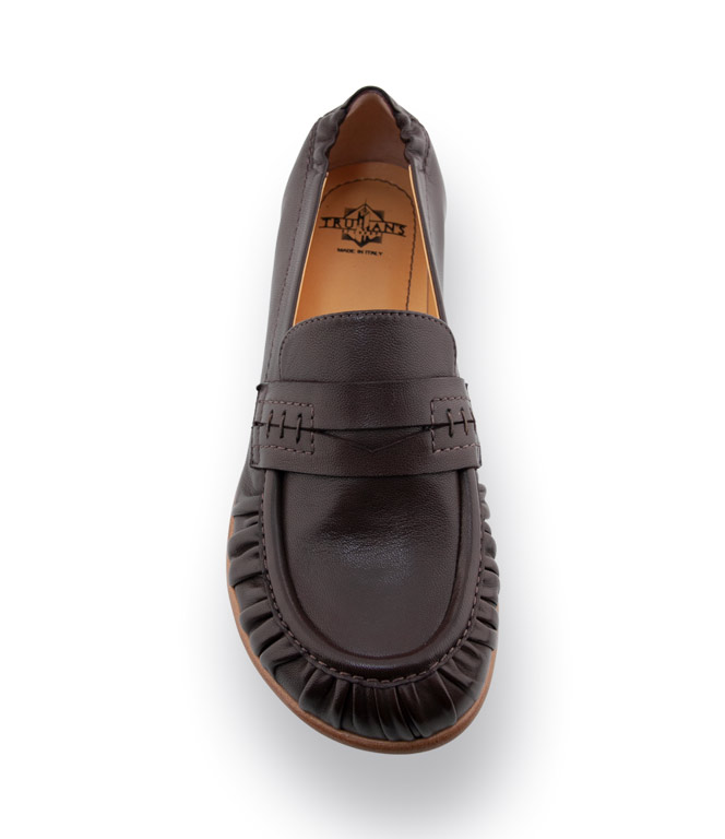 Der Trumans Loafer in Dunkelbraun aus softem Nappaleder verbindet zeitlose Eleganz mit maximalem Komfort. Die klassische Collegespange und der in feine Falten gelegte Abschluss verleihen dem Modell eine stilvolle, leicht lässige Note. Durch den bequemen, etwas breiteren Leisten und den Gummizug an der Ferse sitzt der Schuh perfekt, ohne einzuengen. Weiches Lederfutter und eine flexible Gummisohle sorgen für angenehmes Gehen den ganzen Tag. Die aufwendige Sacchetto-Machart steht für Handwerkskunst auf höchstem Niveau – gefertigt in einem kleinen italienischen Familienbetrieb nahe Venedig.