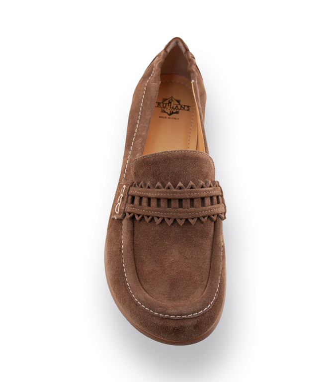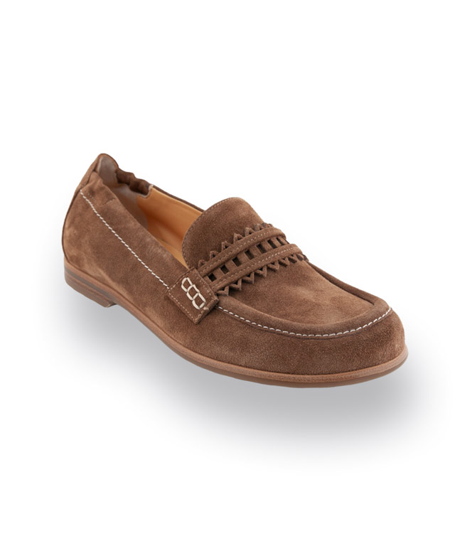 Der Trumans Loafer in Naturbraun mit hellen Nähten überzeugt durch seine bequeme, etwas breitere Form und liebevolle Details. Die fein gestanzte Lederspange auf dem Blatt verleiht dem Schuh eine edle, aber dennoch lässige Note. An der Ferse sorgt ein Gummizug für eine sehr gute Passform und angenehmen Halt, ohne zu drücken. Das superweiche Veloursleder, hochwertiges Lederfutter und die weiche, flexible Gummisohle garantieren hohen Tragekomfort im Alltag. Dank der aufwendigen Sacchetto-Machart steht dieser Loafer für italienische Handwerkskunst vom Feinsten – gefertigt in einem kleinen Familienbetrieb nahe Venedig.