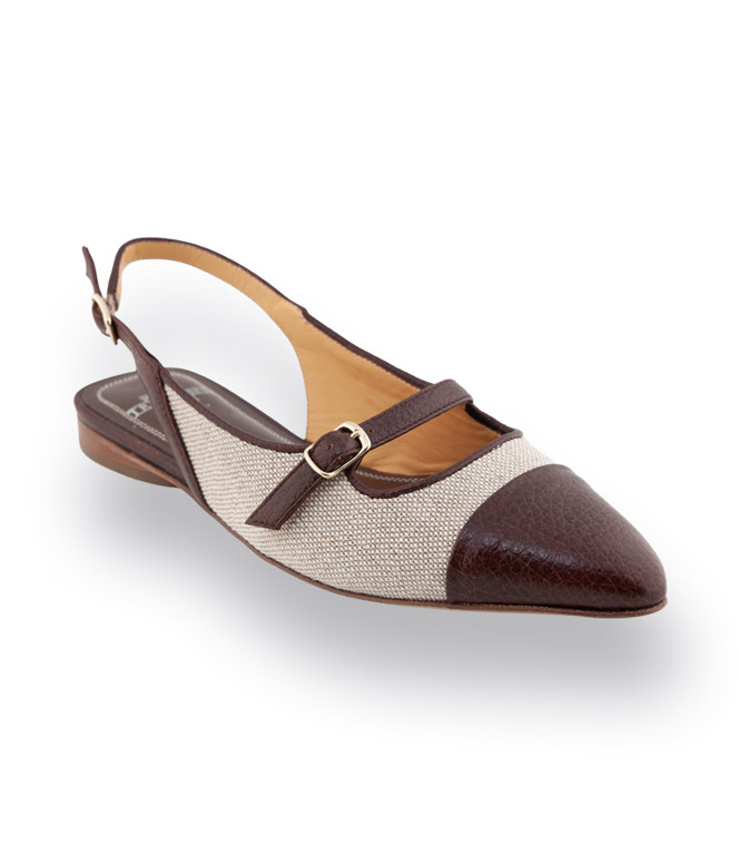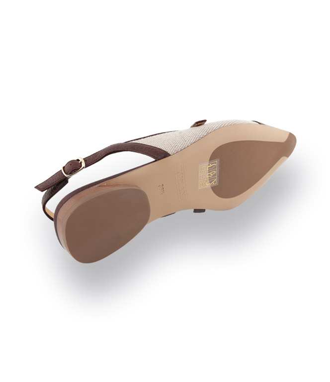- Detail: spitzer Sling in dunkelbraun mit beige Leinen und edler Machart Sacchetto