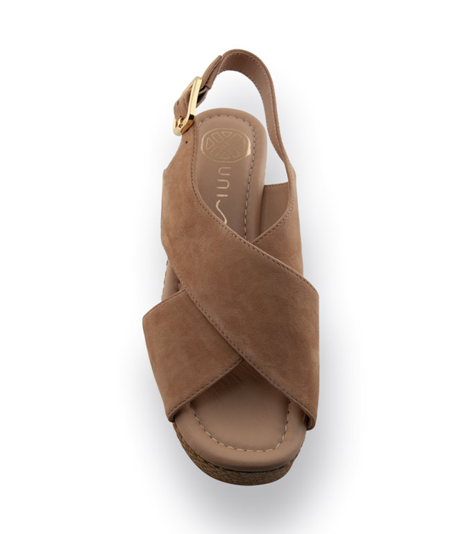 Die Unisa Sandalette Kaifu in Beige vereint sommerlichen Boho-Charme mit hohem Tragekomfort. Weiches Veloursleder trifft auf ein mit Bast überzogenes Plateau und einen passenden Absatz – das wirkt luftig, modern und passt ideal zu sommerlichen Looks. Die markante Kreuzbandage hält den Fuß sicher und sorgt zugleich für eine feminine Silhouette. Lederfutter und weich gepolsterte Decksohle schmiegen sich angenehm an den Fuß und machen Kaifu auch an langen Tagen bequem. Der ca. 7,5 cm hohe Absatz wird durch das etwa 3,5 cm starke Plateau deutlich entschärft. Eine stabile Kunststoffsohle bietet sicheren Auftritt – perfekt zu Kleid, Jeans oder weiter Sommerhose.