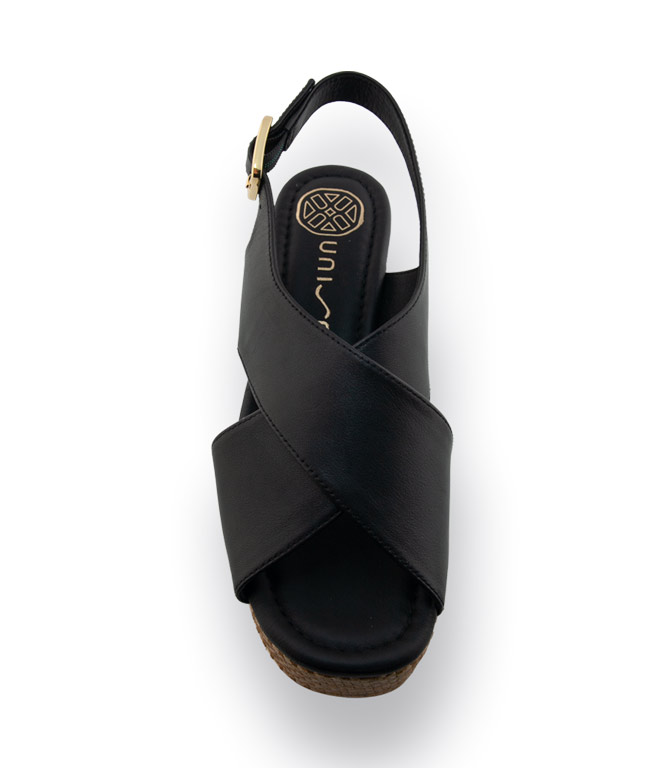 Die Unisa Sandalette Kaifu in Schwarz vereint sommerlichen Stil mit hohem Tragekomfort. Weiches Glattleder, ein mit Bast überzogenes Plateau und der bezogene Absatz verleihen dem Schuh eine modische, leicht mediterrane Note. Die markante Kreuzbandage bietet guten Halt und umschließt den Fuß sicher und bequem. Dank Lederfutter und weich gepolsterter Decksohle trägt sich Kaifu auch an langen Tagen angenehm. Der Absatz von ca. 7,5 cm wird durch das etwa 3,5 cm hohe Plateau spürbar abgefedert und wirkt dadurch deutlich bequemer. Die stabile Kunststoffsohle sorgt für einen sicheren Auftritt – perfekt zu Kleid, Jeans oder Sommerhose.