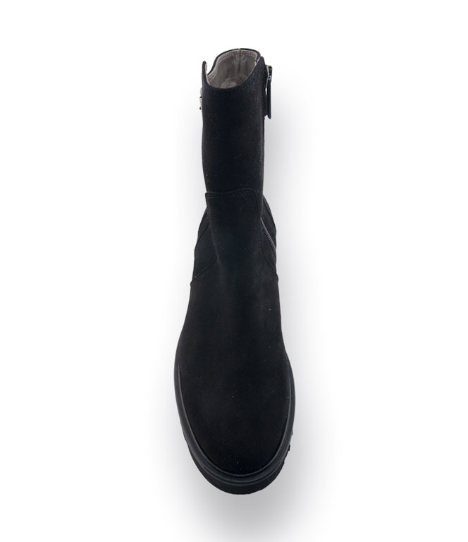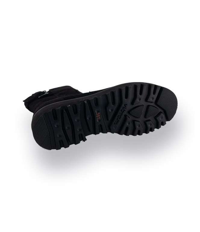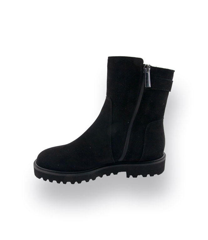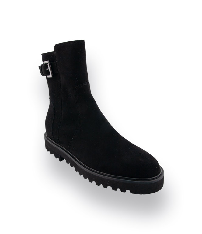 Die Viamercanti Stiefelette in Schwarz überzeugt durch hochwertiges Veloursleder und ein wärmendes Lammfellfutter, das auch an kalten Tagen für ein angenehmes Tragegefühl sorgt. Die dekorative Schnalle verleiht dem Modell einen modernen, sportlichen Look. Die besonders leichte Gummisohle mit Vibram-Profil garantiert sicheren Halt und Flexibilität im Alltag. Mit einer Absatzhöhe von ca. 3 cm (abzüglich dickem Boden) und einer Schafthöhe von etwa 24 cm ist diese Stiefelette ideal für Frauen, die Komfort und Stil gleichermaßen schätzen. Ein modisches Statement für jede Garderobe.