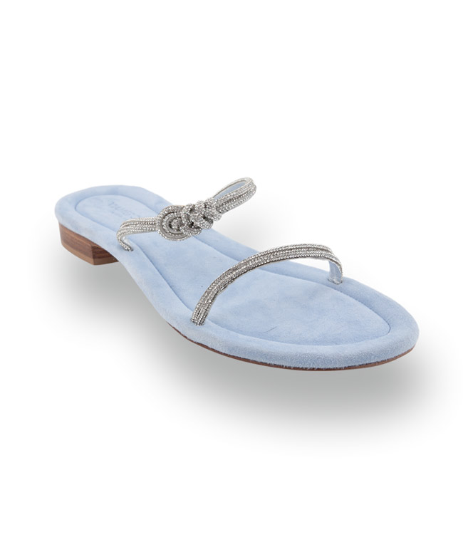 Diese Pantolette von Viamercanti besticht durch Riemchen mit Strasssteinen. Ein geflochtener Knoten am Spann sorgt für eine besondere Optik. Die hellblaue Veloursdecksohle bietet angenehmen Tragekomfort bei jedem Schritt. Ein Glasstein in der Sohle setzt einen edlen Akzent. Ein stilvolles Modell mit Komfort und eleganter Ausstrahlung.