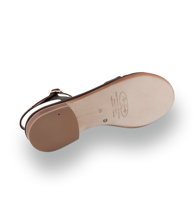 Diese Sandale von Viamercanti besticht durch ihr Nappaleder in Dunkelbraun. Die weich gepolsterte Kreuzbandage schmiegt sich angenehm an den Fuß, während ein feines Riemchen sicheren Halt bietet. Die gepolsterte Decksohle sorgt für hohen Tragekomfort bei jedem Schritt. Ein Glasstein in der Sohle setzt einen besonderen Akzent. Ein stilvolles Modell mit Komfort und italienischem Flair.
